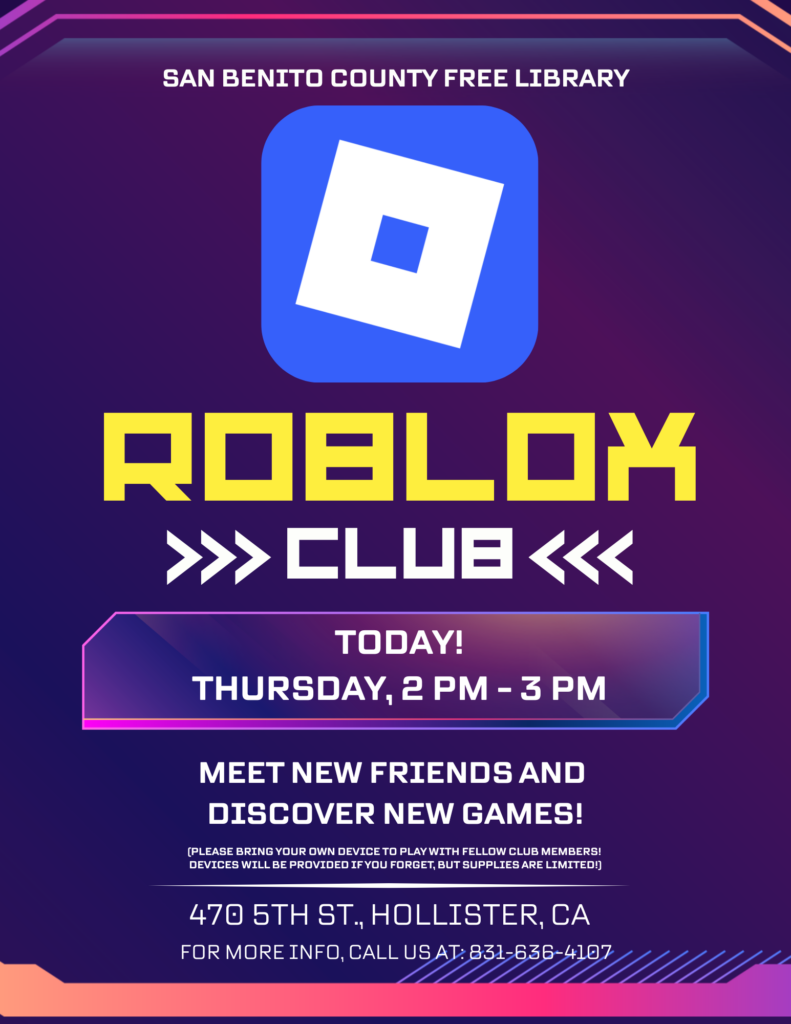 Roblox Club is TODAY @ 2pm! By Jean Luc Miranda | February 5, 2026 - 7:00 AM |January 29, 2026 Children Services, Community, Kids, News, Services Roblox Club is TODAY, Thursday, February 5th @ 2pm! Meet new friends and discover new games! 470 5th Street, Hollister CA, 95023 For more info, give us a call at: 831-636-4107 Bookmark the permalink.