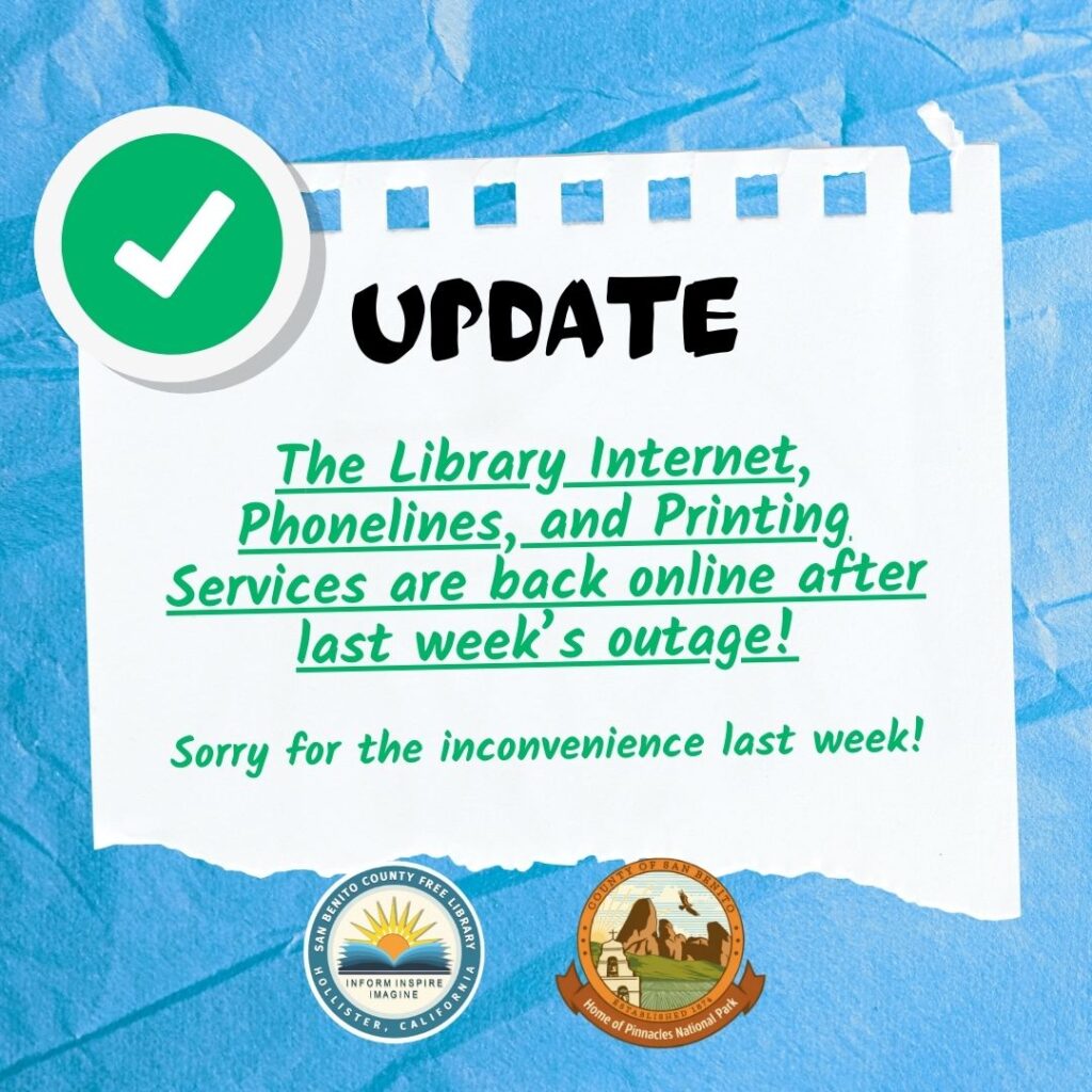 The Library Internet, Phonelines, and Printing Services are back online! By Jean Luc Miranda | March 9, 2026 - 11:26 AM |March 9, 2026 Community, News Update: The Library Internet, Phonelines, and Printing services are back online after last week’s outage! Sorry for the inconvenience last week! Bookmark the permalink.